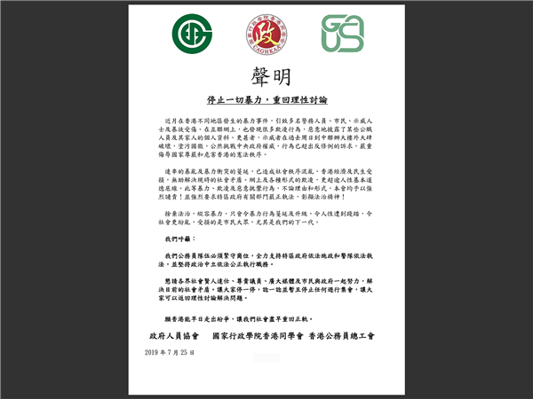 據傳媒報道,近400名行政主任(Executive Officer)昨附上不同政府部門委任證作證明的匿名聯署,指對特首林鄭月娥處理逃犯條例修訂及白衣人打人事件的手法深表遺憾,批評警方沒有盡保護市民之責。公開信指如果政府繼續漠視民意,他們將會籌備工業行動。