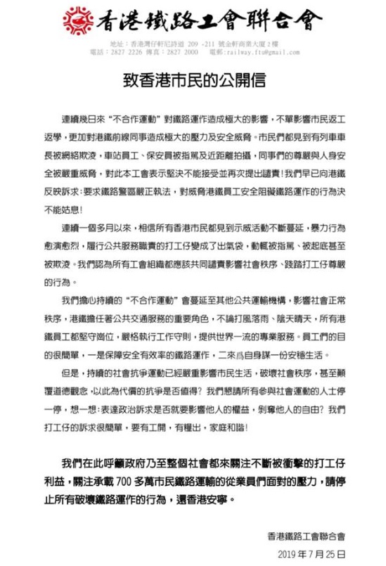 公開信又要求鐵路警區嚴正執法,對威脅港鐵員工安全,及對鐵路運作的行為決不姑息。