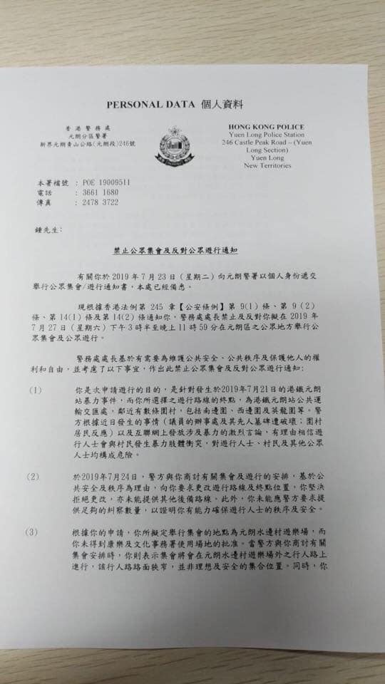 於今日下午發出的通知書指,據香港法例第245章《公安條例》第9(1)條、第9(2)條、第14(1)條及第14(2)條,警務處長禁止及反對擬在本周六下午3時半至晚上11時59分在元朗區的公眾地方舉行集會及公眾遊行。