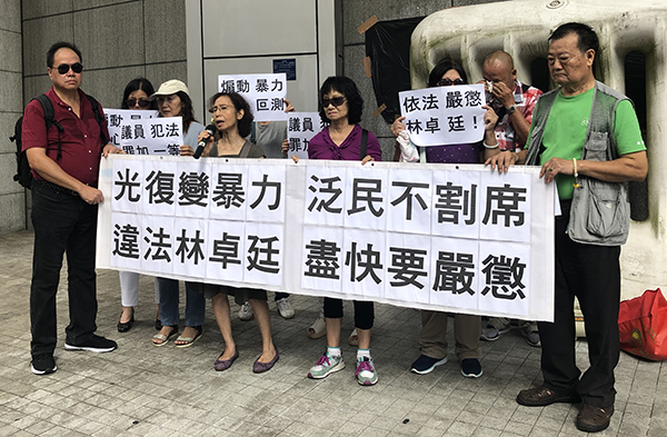 約十名市民到灣仔警察總部請願,促請警方檢舉林卓廷。