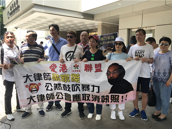 團體指,前大律師公會主席梁家傑在7月中,出席香港大學校長論壇時稱「暴力有時或可解決問題」,公然鼓吹師生接受暴力行為。及後就出現暴徒圍堵衝擊中聯辦、塗污國徽、及黑衣人更進入元朗挑釁,爆發聚眾鬥毆事件。團體批評梁家傑罔顧法治、違反專業操守、宣揚「違法達義」、煽動社會仇恨,鼓動他人勇武違法暴力抗爭,令香港社會陷入持續失序的困局,促請大律師公會取消他的大律師執照。