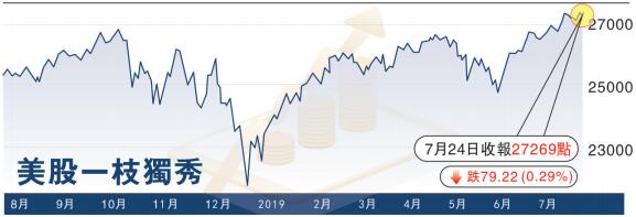 先分享債市,理論上減息直接支持債價,亦是近月債市升勢的信念。年初至今,美國10年國債孳息由最高約2.78%跌至最低約1.95%水平,現在徘徊在2.0%,數據已反映或計入了市場預期今明兩年減息4至5次或共1.25%的憧憬。可是,不論各分析員、央行委員或前任美國聯儲局主席都多次表示,就算7月減息也只是「保險性」減息,即是先行準備應對未來的經濟打擊,或之後再觀察才決定應否再減下去,而非持續地周期性減息,那今天已計入的4至5次減息是否過敏?如果美聯儲7月31日宣布減息,債息有可能出現平整,甚至反彈,以反映早前過敏的反應,那今天才考慮投資成熟市場的債券便有點「摸頂」的味道。除了美債,歐央行已表示有意加大流動性,但在負息債券近年不斷膨脹,甚至佔已發行的投資級別債總值的25%,要在成熟市場中找正債息的市場將會愈來愈難,一是考慮希臘或意大利等歐豬債,或是忍受低過2%的回報,同時要擔心違約風險,投資者須多加注意。