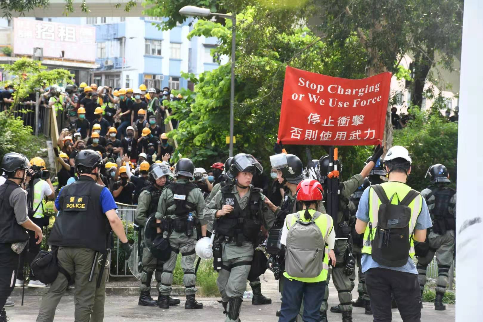 元朗入村的天桥布滿防暴警察,有市民在现场叫嚣,但警员都极为忍耐。