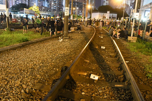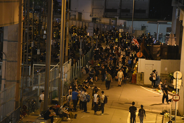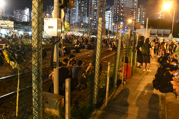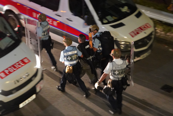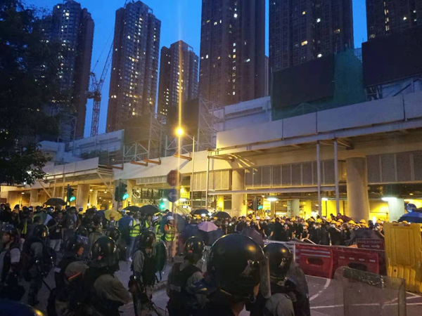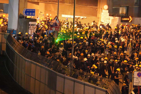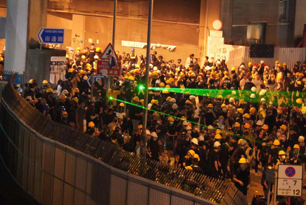 入夜后,示威者不断用镭射灯射向警察,警方要求示威者停止用镭射灯射向警方,和平散去。