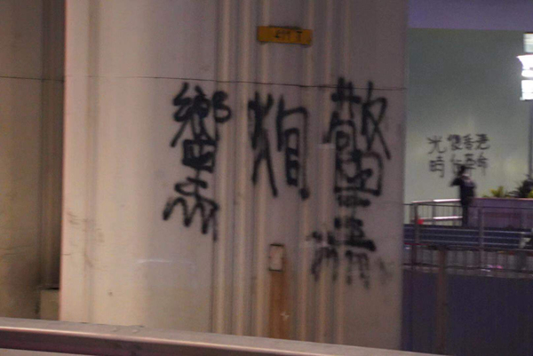 清場后的西邊圍村,在建筑物的墙上、柱子上有許多示威者喷上的侮辱性字跡。