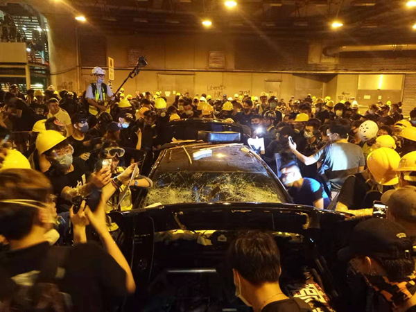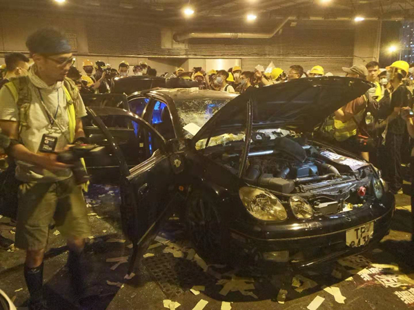 而在西铁站下面的停车场,一辆车被打烂,车里的东西全部翻出来,有棍子和武士刀,车主的个人资料也被曝光。