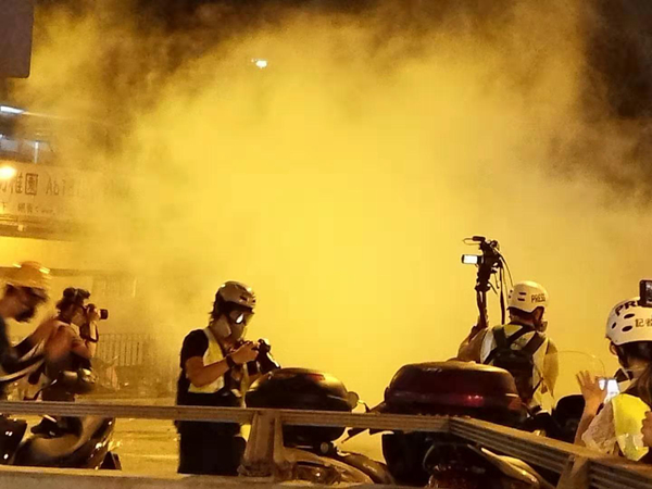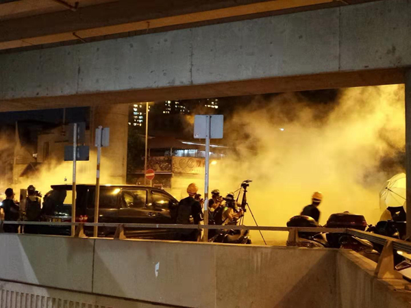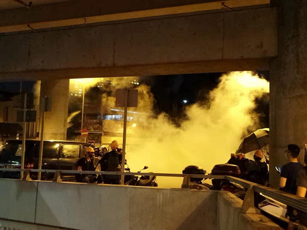 有示威者向在南邊圍村的警察掟雜物,警方施放多枚催淚彈驅散示威者。