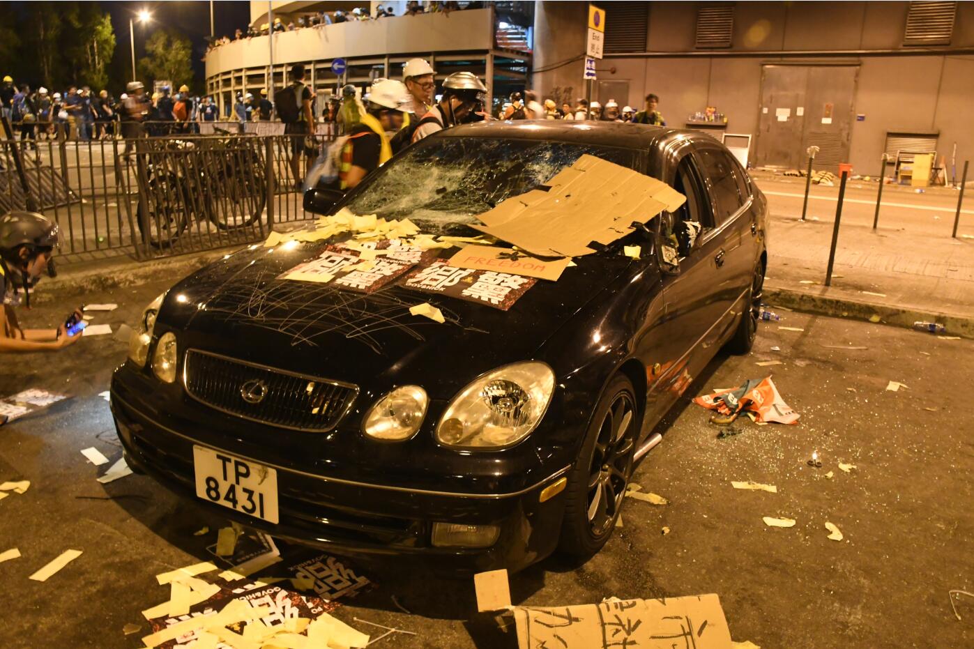 據悉,有人於昨日傍晚時分,在南邊圍村口對出的元朗西鐵站地面,發現一輛ToyotaAristoV300的私家車,看到車內載有至少6條藤條,另有一塊布下遮蓋其他物件,但外型和藤條相似。示威者不問情由,隨即扑爛該車輛的車頭玻璃、乘客位旁的玻璃,刮花車頭蓋。