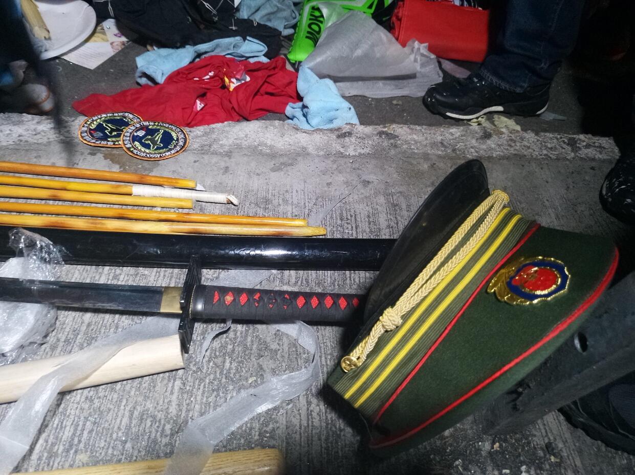 元朗示威者將南邊圍村外一輛私家車擊毀,下圖為示威者撬車尾箱發現的武器及所謂的軍帽。 記者 馮瀚文攝