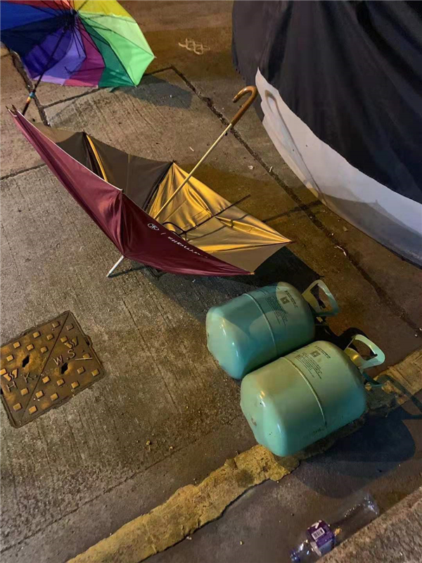 11時20分,上環文咸東街有雜物燒着,火光熊熊,燒着的包括回收桶及垃圾桶,旁邊有竹枝及路邊圍欄,形成路障。相信是示威者撤走前放火,分散注意力。