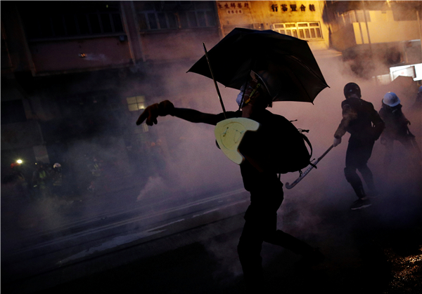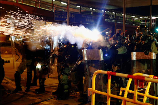 昨晚8 時許,有非法示威者在警方防線前點燃紙皮等雜物縱火,警方防暴隊發射催淚彈驅散。路透社