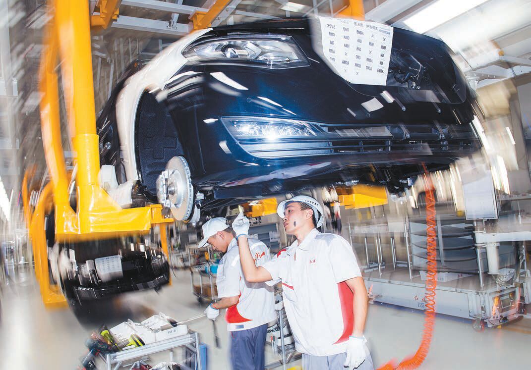 紅旗汽車2019年上半年共計銷售33242 輛, 同比增長255%,超越2018 年全年銷量。圖為一汽紅旗總裝車間。新華社
