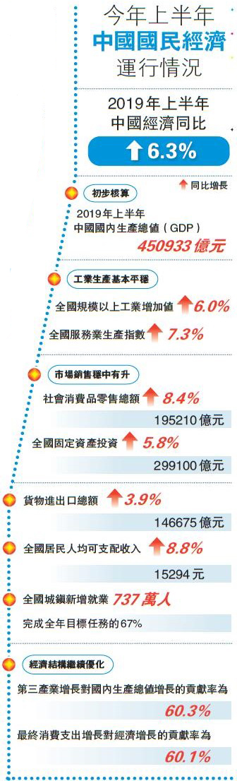 根據國家統計局發布的數據,初步核算,今年上半年國內生產總值450933億元,按可比價格計算,同比增長6.3%,其中一季度增長6.4%,二季度增長6.2%。雖然是呈下滑態勢,但根據二季度部分數據分析,中國經濟企穩已是大概率事件。交通銀行金融研究中心高級研究員劉學智在接受本報採訪時表示,二季度無論是投資、消費還是工業產值都有所增加,反映出中國經濟的韌性仍然很足。從上半年數據來看,中國經濟還有一些亮點,比如經濟結構轉型和產業結構轉型的改善比較明顯。目前,第三產業已佔經濟最大的比重,消費對經濟的拉動達到60%以上,再加上工業領域中的高新技術方面增長也較快,這些都反映出經濟增長的質量提升。