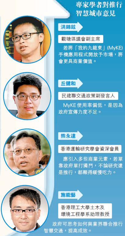 香港理工大學土木及環境工程學系助理教授施能藝亦表示,在開發手機應用程式方面,港鐵、城巴和九巴做得比政府完善,政府可思考如何與業界聯合推行,令成效更為顯著。