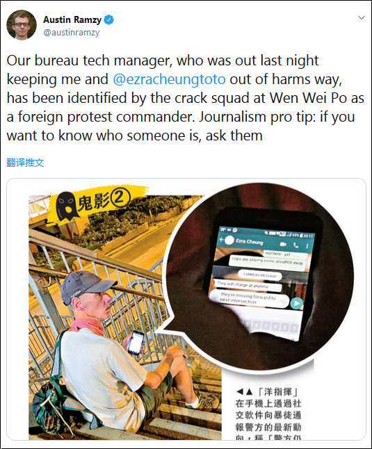 29日,《紐約時報》記者王霜舟(Austin Ramzy)在推特上宣稱,《大公報》拍攝的男子為“我們辦公室的技術經理”,而他聊天的內容,則是為了讓他和“Ezra”“遠離受損害的道路”。