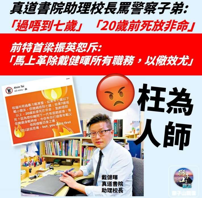 華人基督教聯會真道書院助理校長戴健暉早前在個人社交網站上發表仇警言論,包括「祝福」警員的子女「過唔到7歲」、「死於非命」等言論,又詛咒警員子女早死,令使用過分武力的警員有切身之痛等。