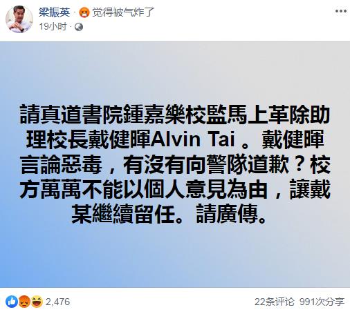 【香港商報网訊】記者周偉立報道:有教師早前在社交網站上發表仇警言論,有關老師為華人基督教聯會真道書院助理校長戴健暉,他在網上寫出詛咒警員子女早死,令使用過分武力的警員有切身之痛等言語。全國政協副主席、前行政長官梁振英去信真道書院校監鍾嘉樂,要求將戴健暉革職,信中指,戴健暉發出惡毒言詞,不僅令香港社會震驚,亦大抵可列為全球教育界之恥,事件不得以「純屬個人意見為辯解」,敦促校方馬上革除戴健暉所有職務,以儆效尤。