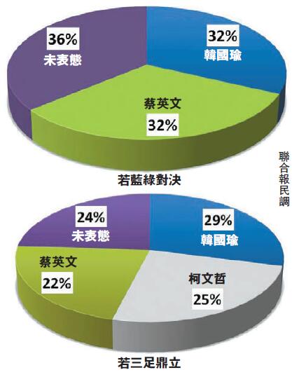 【香港商報网訊】國民黨28日召開黨代會確定推出高雄市長韓國瑜代表藍營出征2020年台灣大選,根據「聯合報民調中心」最新民調顯示,若明年為藍綠對決的局面,韓國瑜和蔡英文各以32%的支持度戰成平手。若無黨籍柯文哲加入戰局,在3人角逐的情況下,韓國瑜以29%的支持度領先,柯文哲的25%暫居第二及蔡英文22%殿後。