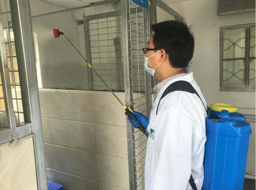 海關關員對進境寵物隔離場地進行消毒(攝影:余小密)