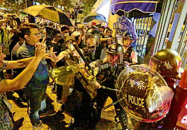 一名警长见情况危急,一度从冲锋车上取出雷明登霰弹枪,擎枪指向激进分子。双方发生冲突,防暴警察冲出警署进行驱赶。