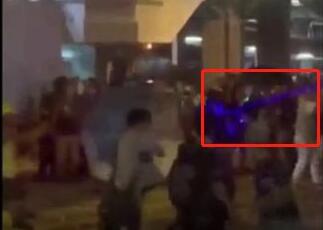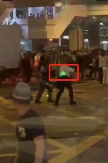 在昨晚的冲突中,两名警察在葵富路与葵仁路交界处被一群示威者团团围住。记者收到的一段现场视频显示,两名警察被近百人围住并殴打,还有暴徒向警察投掷不明物体,一名警察挥舞警棍自卫,一名白衣警察则不得已举起手上的枪瞄准暴徒予以警告。在警察被围殴后,外围的暴徒还用激光笔照射,试图使警察丧失防卫能力。