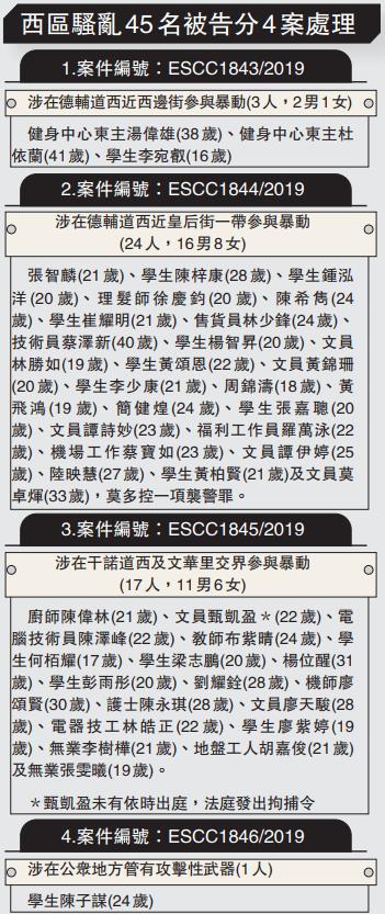 最後處理的11男6女,共17名被告同被控暴動罪。控罪指眾人於本年7月28日在上環干諾道中及文華里交界附近,連同其他人參與暴動。案中22歲報稱任文員的甄凱盈沒有到庭應訊,法庭遂對她發出拘捕令,並撤銷其擔保。