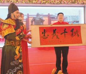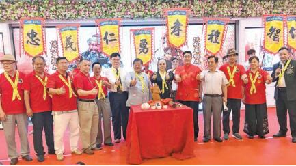 關公扮演者祝斌傑(左)前來祝賀,右為世界關公 文化聯合發展總會會長李成友。