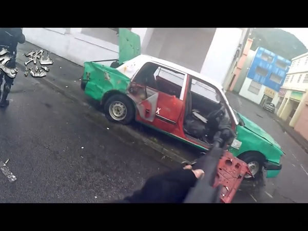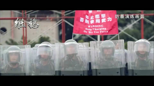 短片展示士兵進行防暴演練,士兵配備長盾並列隊,舉起類似港警驅散人群的「紅旗」,並驅趕暴力示威人士。