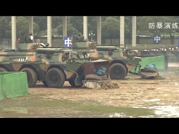 駐香港部隊昨日舉行慶祝建軍節92周年酒會,會上播放平暴演練的片段,包括出動裝有推土功能的裝甲車。片段截圖