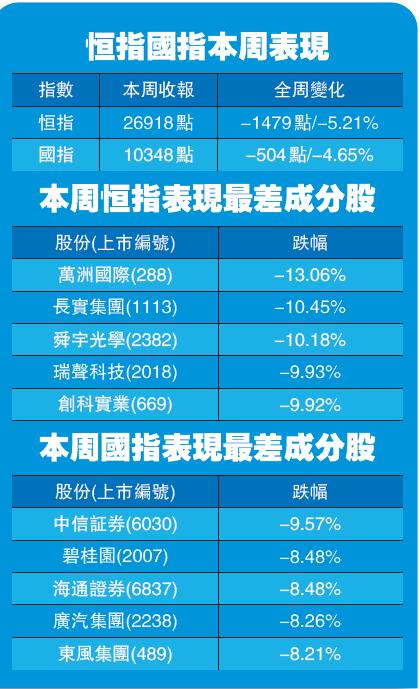 【香港商報网訊】記者吳天淇報道:美國總統特朗普周四晚突然宣布將於9月起對3000億美元中國商品加徵10%關稅,震動金融市場。港股周五急挫647點,恒生指數收報26918點;國企指數跌272點,報10348點。總結全周,恒指累瀉1479點或5.2%,為去年2月以來最大單周跌幅,連跌兩周累挫1846點或6.4%。
