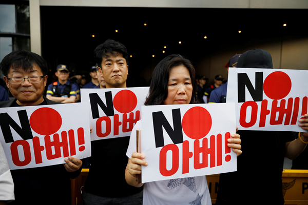 韓國民眾昨日在首爾的日本大使館門前舉行抗議集會,示威標語上寫着「禁止安倍」。路透社