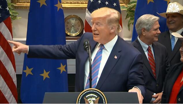 在一群贸易官员和牛肉行业代表的簇拥下,特朗普在白宫宣布了这项协议,旨在“降低欧洲的贸易壁垒,扩大美国农民和牧场主的欧洲市场准入”。