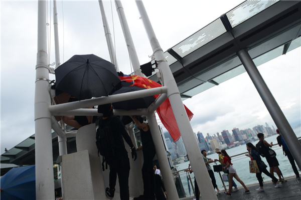 昨日有網民發起旺角遊行,其後示威者不按原定路線行走,大批人更走出旺角彌敦道,並走到尖沙咀廣東道、梳士巴利道一帶。傍晚6時左右,在尖沙咀碼頭對開5支旗杆位置,有一群身穿黑衣及蒙面的示威者,在同黨張開雨傘遮擋下,爬上旗杆將國旗除下,該面國旗之後更被人投擲到附近海面,期間有人拍下照片及影片,上載到網上討論區。