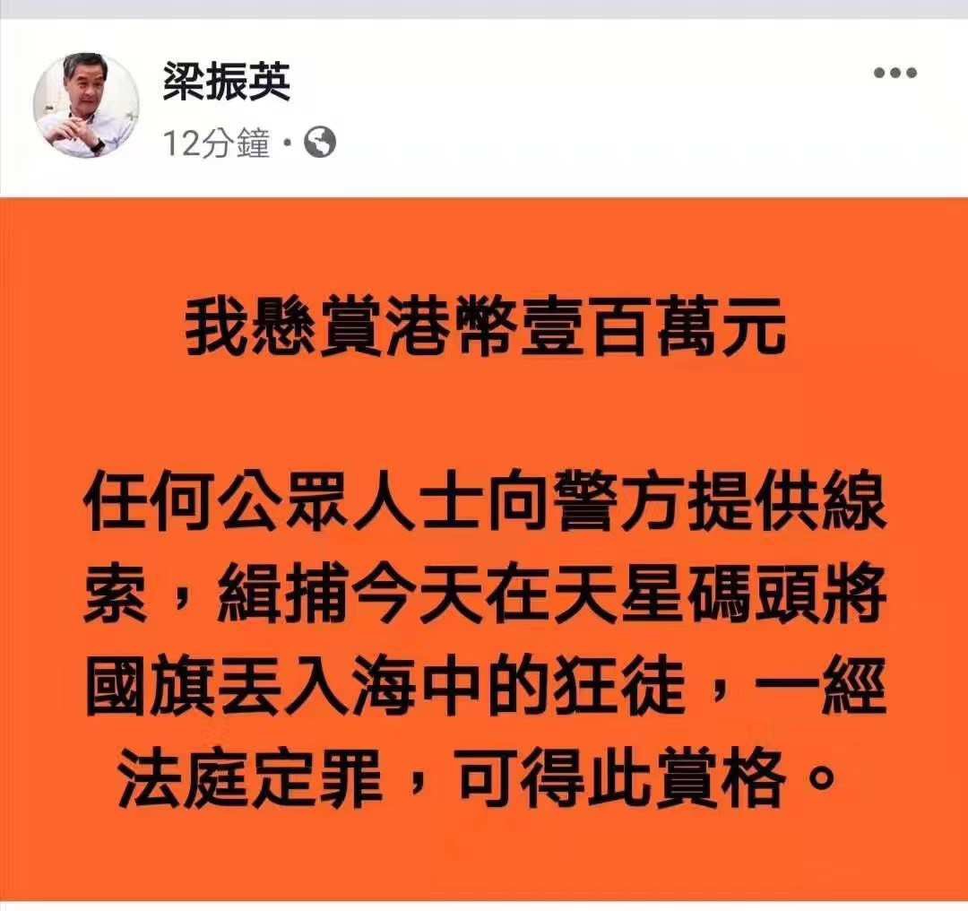 梁振英批評借反對修訂《逃犯條例》為名的狂徒侮辱國家、衝擊警察、破壞秩序,肆虐香港,必須繩之以法:「我懸賞港幣100萬元,任何公眾人士向警方提供線索,緝捕今天(3日)在天星碼頭將國旗丟入海中的狂徒,一經法庭定罪,可得此賞格。」