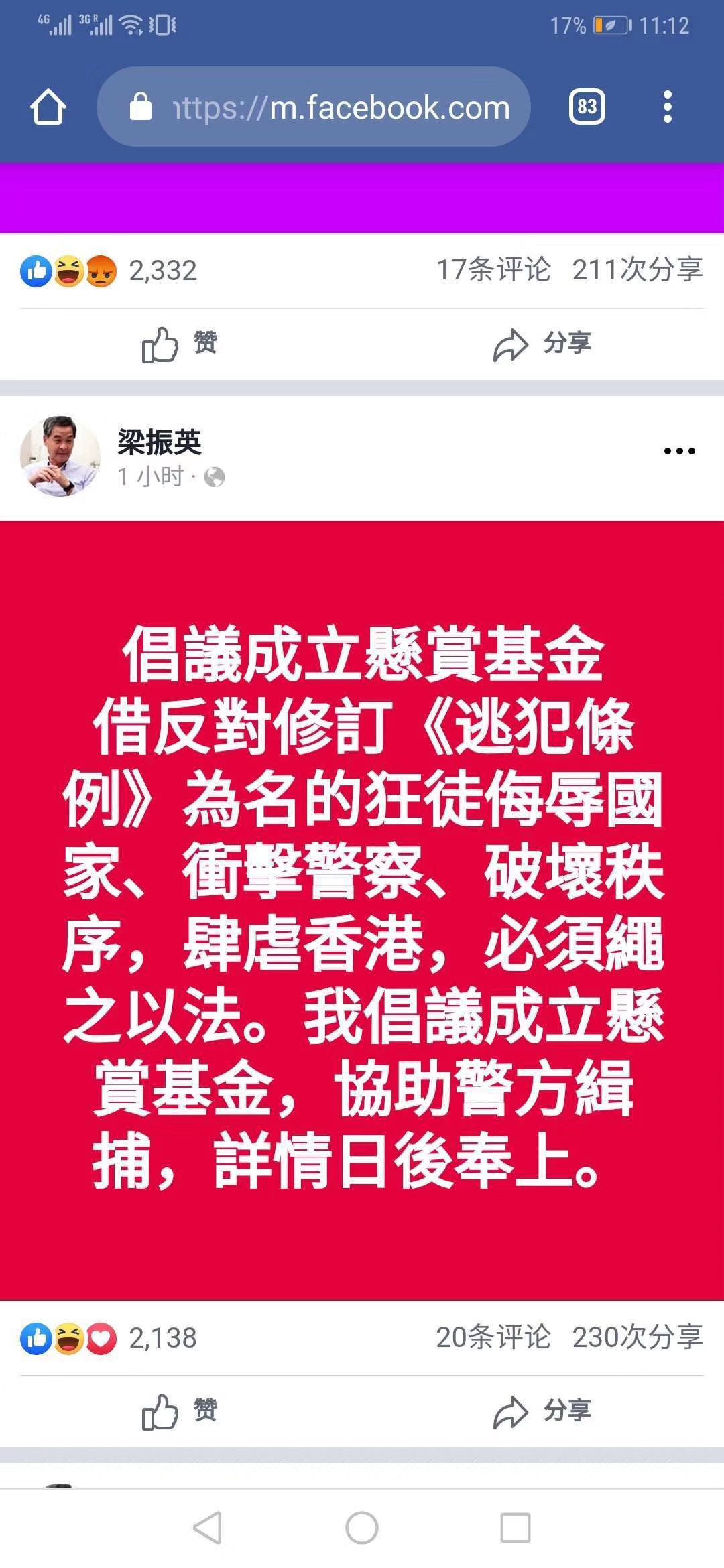 全國政協副主席、前行政長官梁振英昨晚在Facebook宣布,懸賞100萬元緝拿暴徒。他表示,狂徒此舉引起全國人民極大憤慨:「我作出最強烈的譴責,並請全港市民提供資料,全力協助緝捕狂徒歸案。」此外,CY倡議成立懸賞基金,協助警方緝捕,詳情日後奉上。