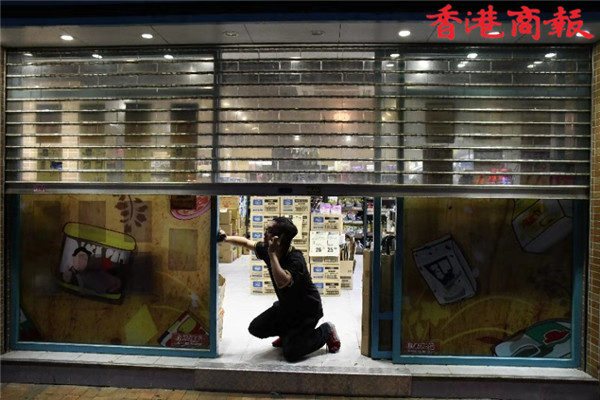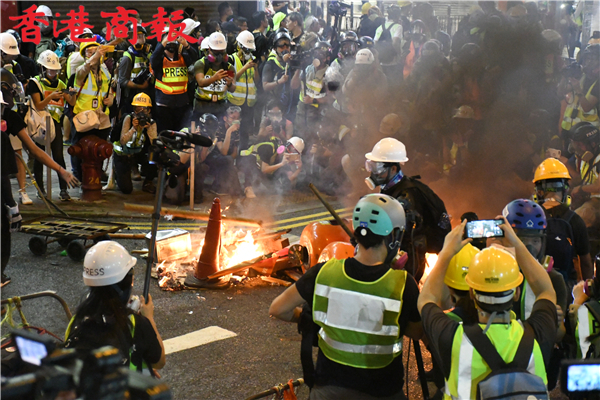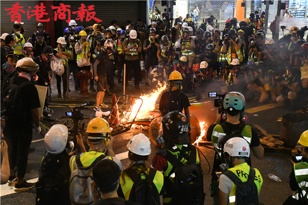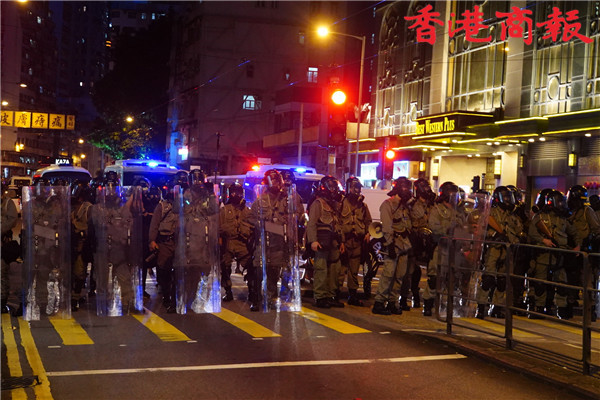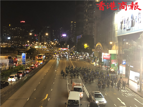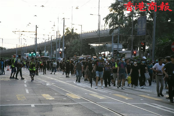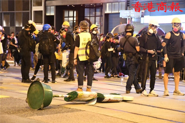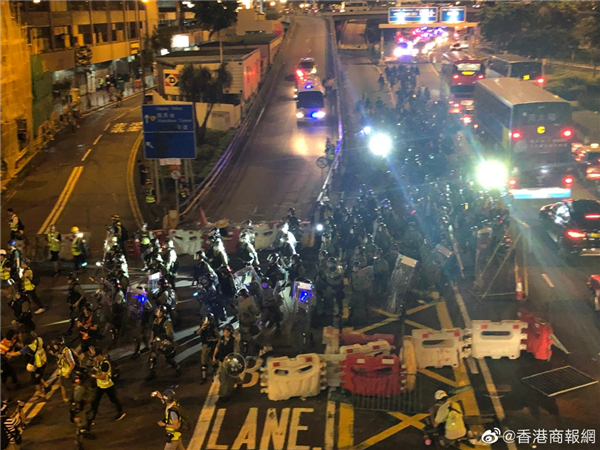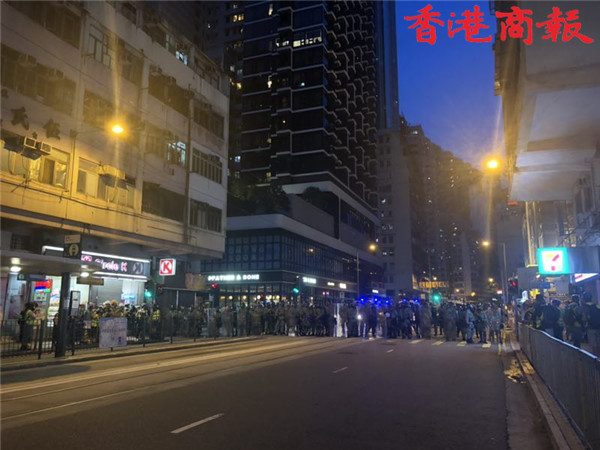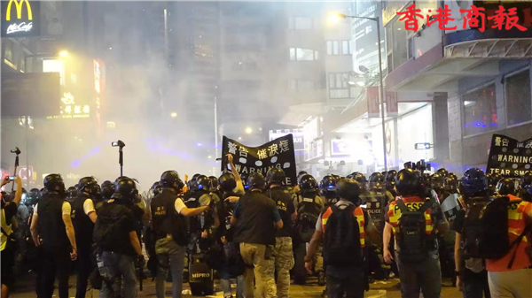 【香港商報網訊】記者馮煒強、馮瀚文、劉深、木子報道:今日(8月4日)示威遊行延伸到將軍澳及港島西。其中,港島西集會於卑路乍灣公園舉行。集會於下午5時開始,數以千計身穿黑衣市民坐滿卑路乍灣公園。晚上近七時,部份示威者開始「行街」步出馬路,並向東行朝中聯辦前進,佔領部份行車線。防暴警舉黑旗警告會出催淚煙驅散,其後一連施放數枚催淚彈。大批示威者後退,並轉向銅鑼灣。