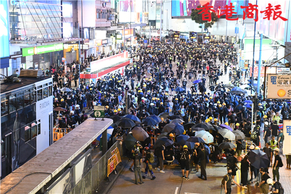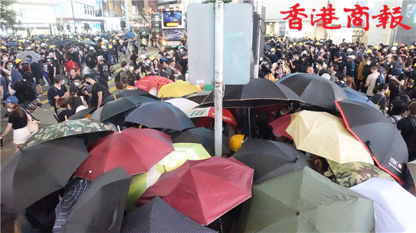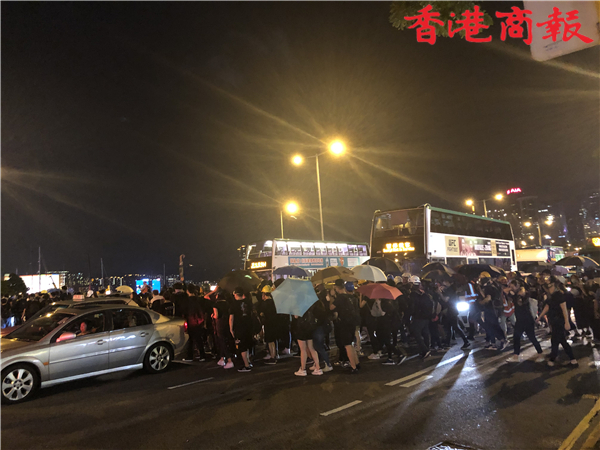 【20:55】有示威者衝出銅鑼灣世貿中心對出東區走廊,令路面出現嚴重堵塞,現場交通陷入癱瘓。