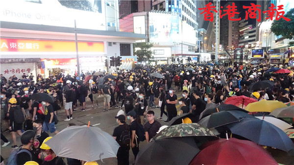 【20:30】示威者由西環轉到銅鑼灣,數千名黑衣示威者,堵塞馬路,佔據怡和街,晚上約8分30分,平日熱鬧的怡和街及記利佐治街,兩旁的商鋪已經全部關門。