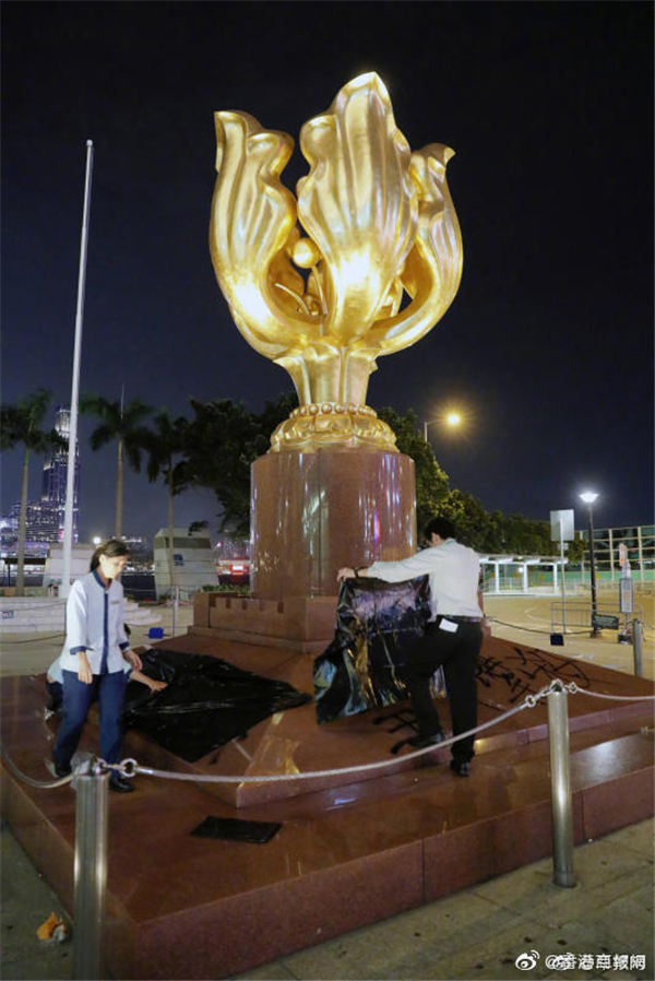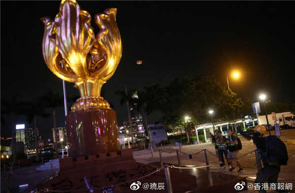 【示威者塗鴉金紫荊雕塑】黑衫暴徒塗鴉金紫荊!公開資料顯示,金紫荊雕塑是中央人民政府贈予香港特別行政區政府的賀禮,紀念1997年香港回歸。