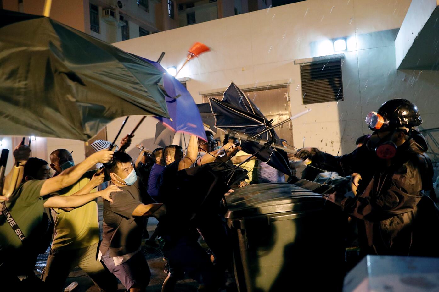 黃大仙紀律部隊宿舍居民在家門口抵抗全副裝備的示威者攻擊。 路透社