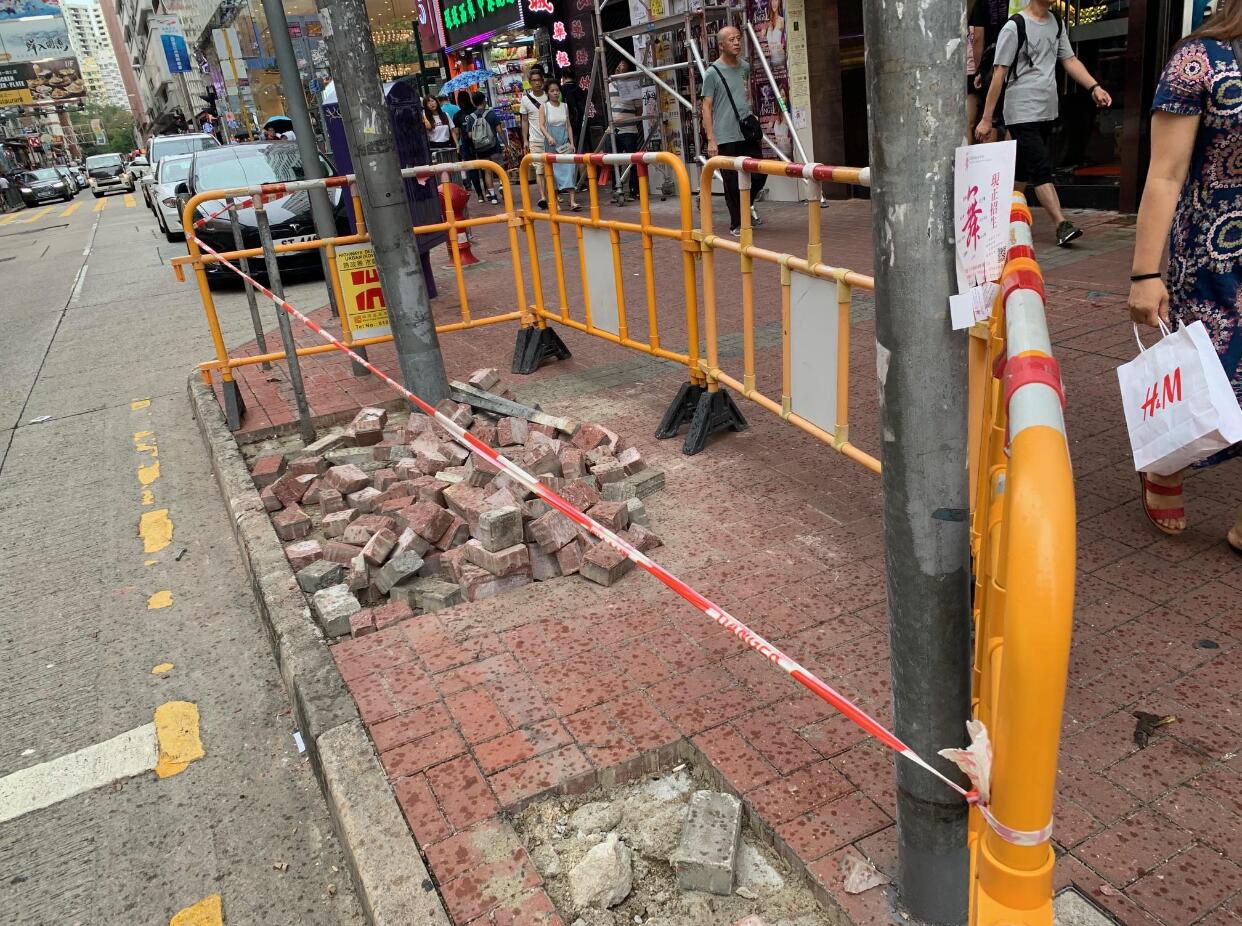 彌敦道與登打士街交界中,仍有被暴徒撬起的磚頭 置於路邊。