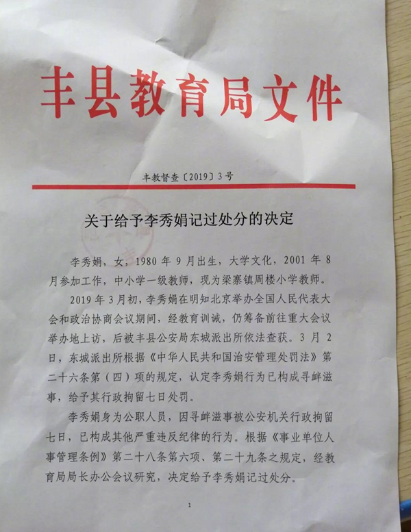 李秀娟表示,因此前有上訪記錄,2019年3月原本想帶女兒赴京治療眼傷,卻被當地懷疑「上訪」而被拘留7天,期間遭到毆打等「不公平對待」,要求其承認「上訪」。文中寫到,出發之前,3月1日晚,徐州豐縣教育局信訪辦公室主任丁攀、梁寨鎮中心校領導陳晨、張超和王會計來到李秀娟家中,要求其退掉3月3日去北京的車票。約半小時後,家裏又來了4位民警,「他們以我涉嫌尋釁滋事為由要將我帶走。」