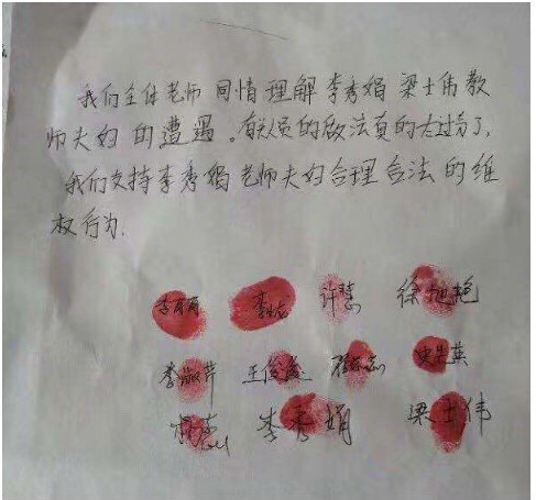 學校教師為李秀娟寫聯名信,稱同情其遭遇。