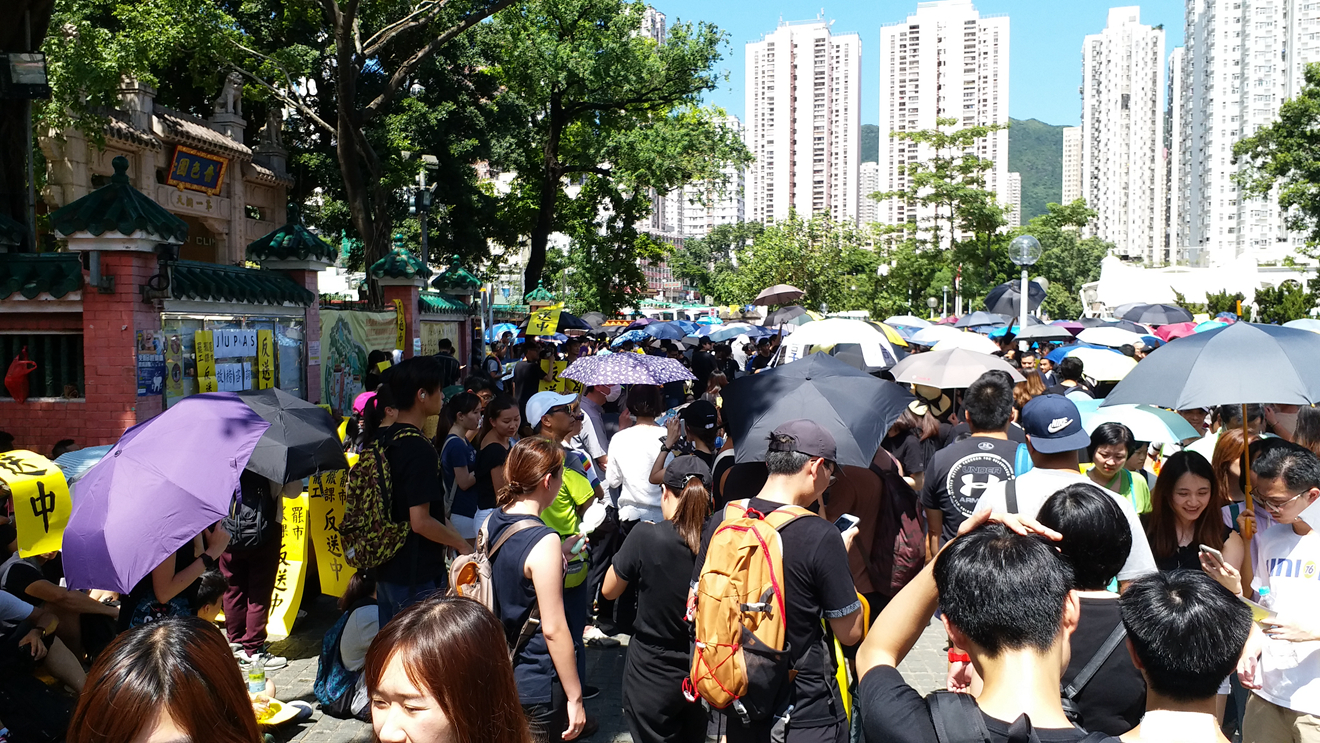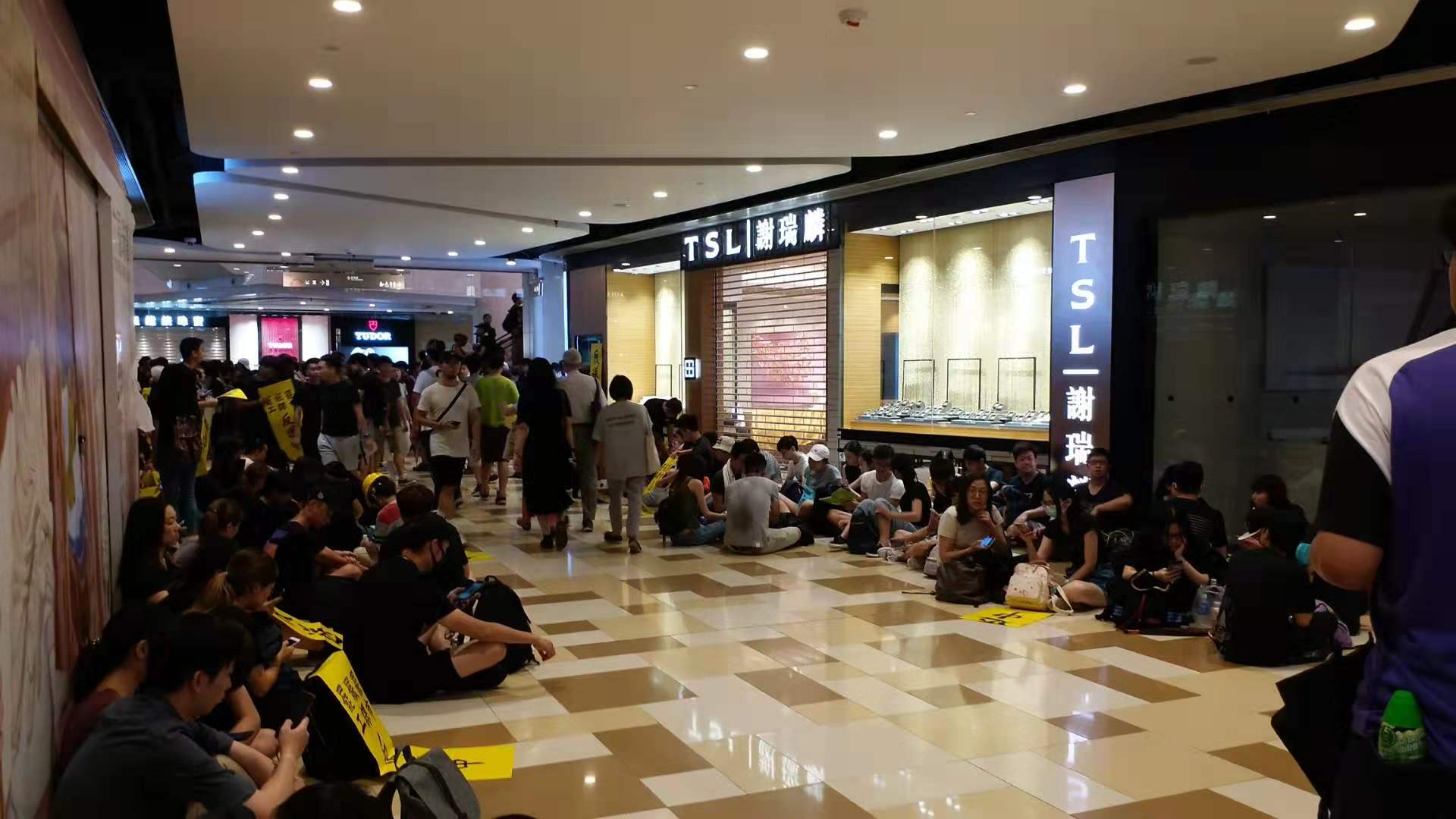 【14:23】黃大仙中心北館有大批示威者席地而坐,多間商店停業,珠寶店有職員留守但落閘沒有營業。另外在黃大仙廣場亦有大批示威者集會,嗇色園黃大仙祠關門。