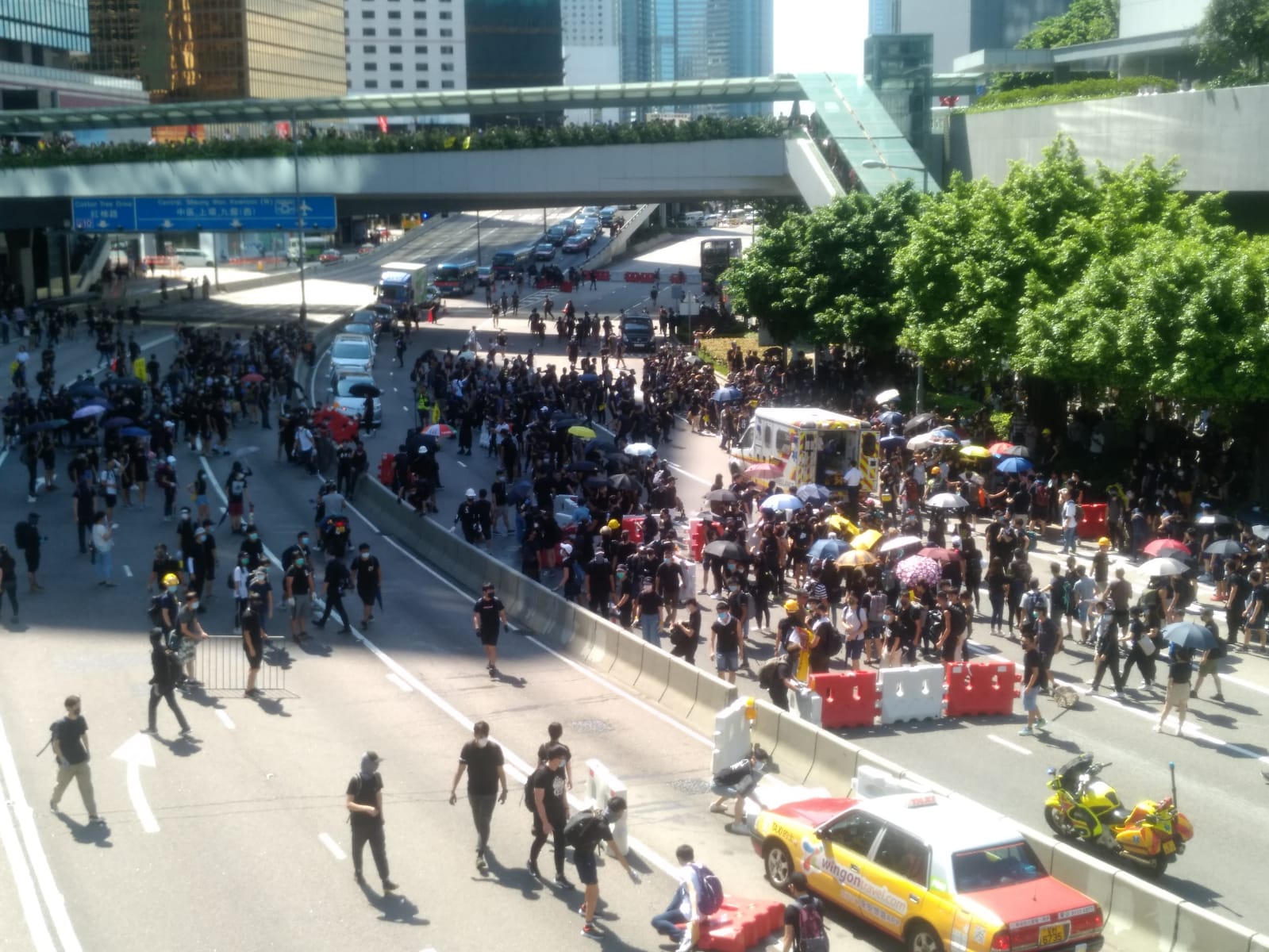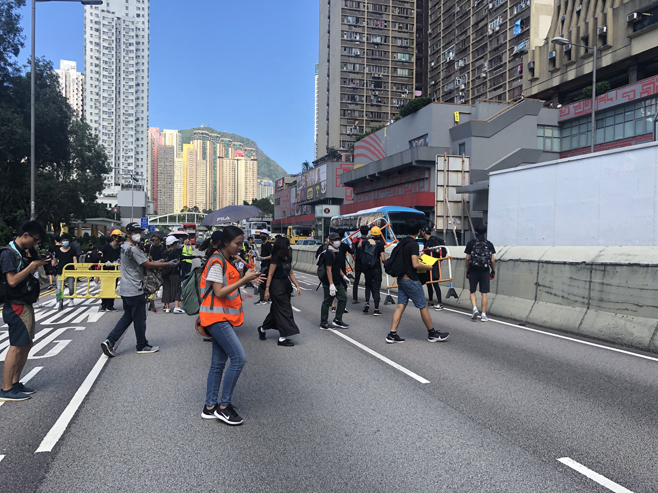 【15:03】在黃大仙集會的示威者衝出马路,並用欄杆、水馬等雜物再次堵塞龍翔道,堵塞向觀塘方向行車线。現時6條來回行車線均已被堵塞。