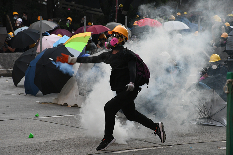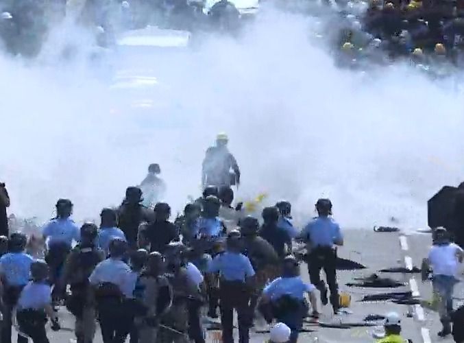 【18:28】警方向示威者发出警告并发射催泪弹驱离。