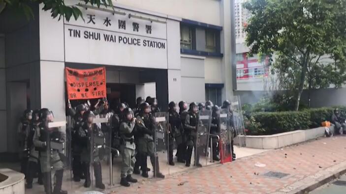 【15:36】大批示威者包圍天水圍警署,並向警務人員投擲石頭,防暴警察施放催淚煙,驅散示威者。警察持長槍戒備,并舉起「橙旗」,要求示威者速離,否則會開槍。