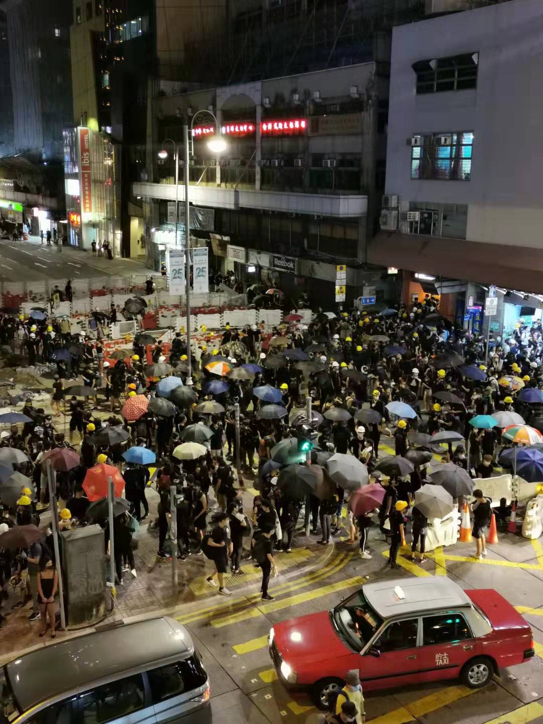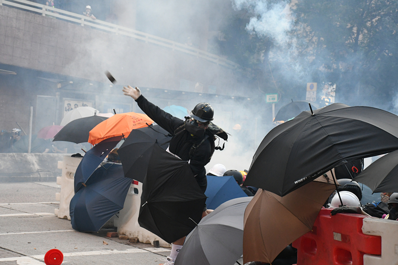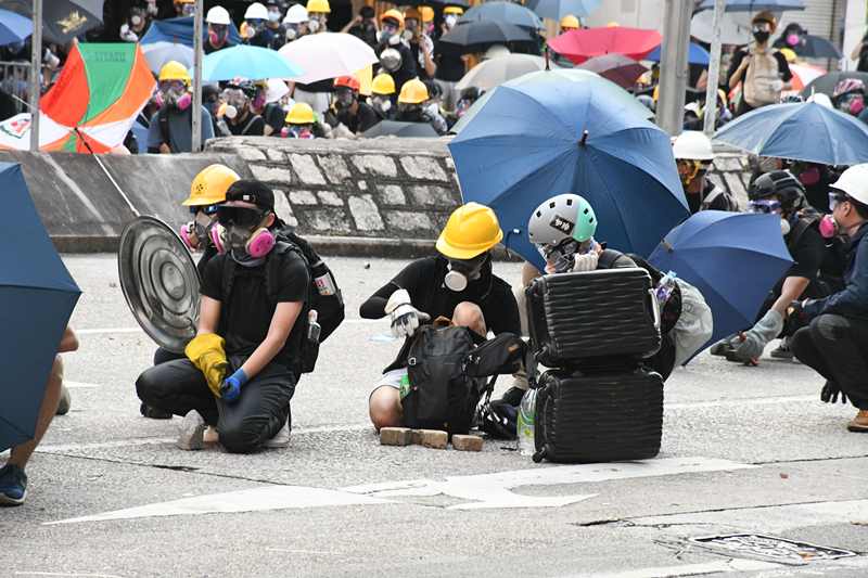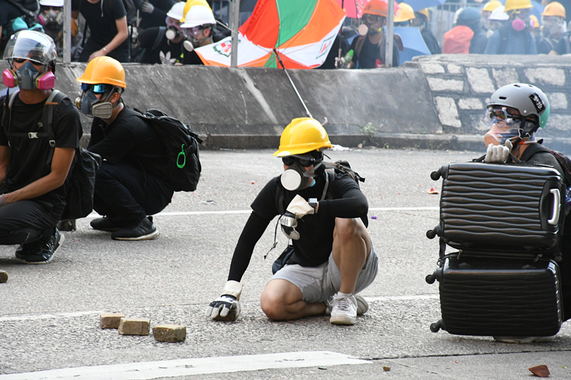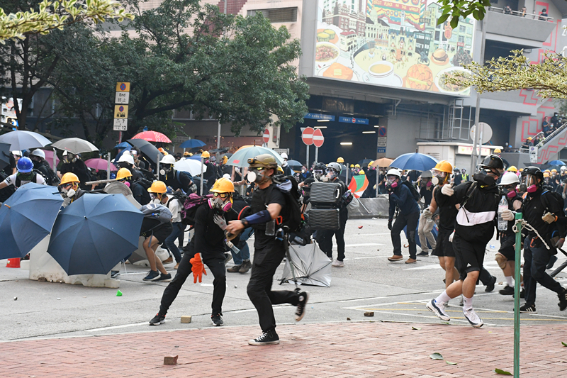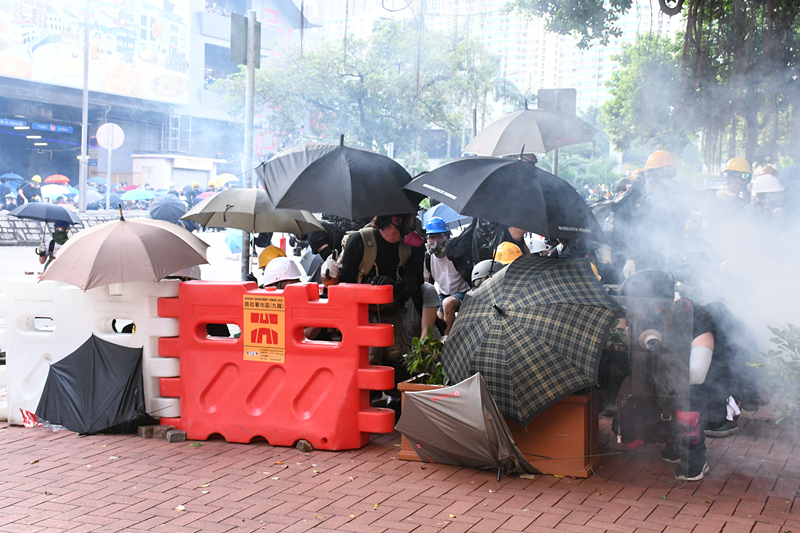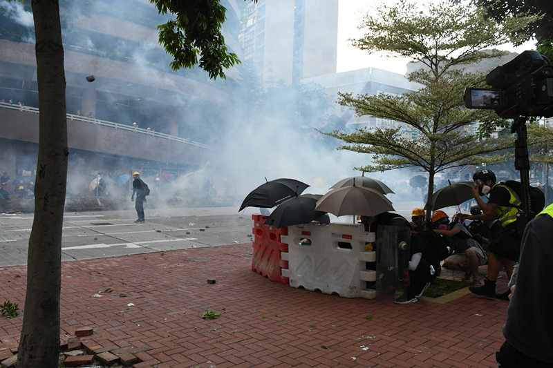 【18:24】示威者在黄大仙与警方发生激烈冲突,部分示威者以行李箱、雨伞、水马作盾牌,向警方投掷砖块。