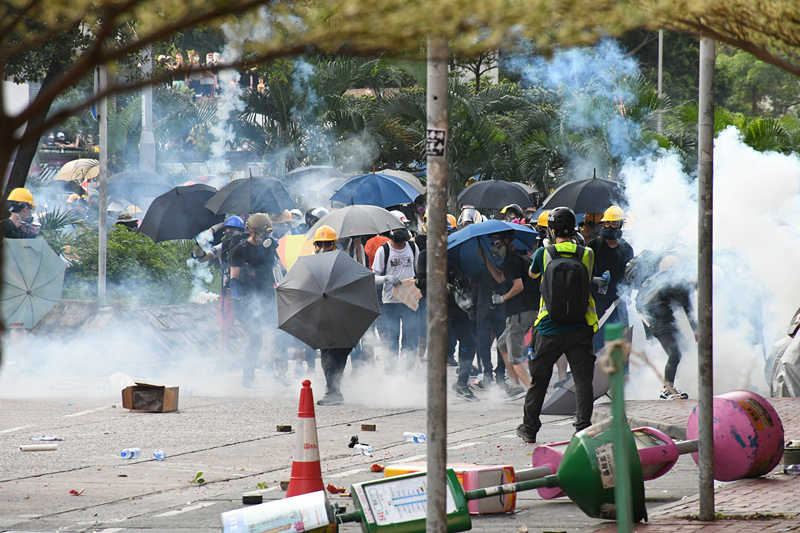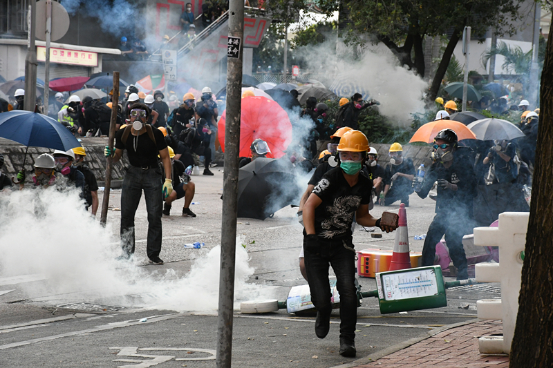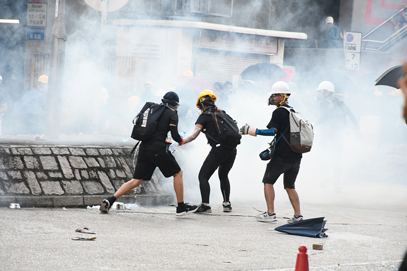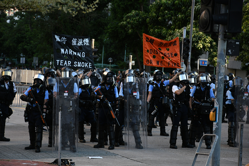 警方舉起黑旗,要求在場示威者離開,并在龍翔道施放十數枚催淚彈,驅散示威者,示威者走上行人路,仍未散去。