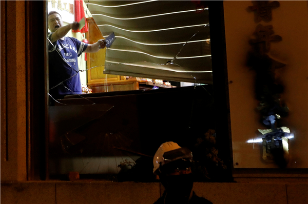 全副武裝的暴徒在北角搗亂,攻擊一家社團會址,有成員在被打爛玻璃後,揮刀對暴徒作出警告。 路透社
